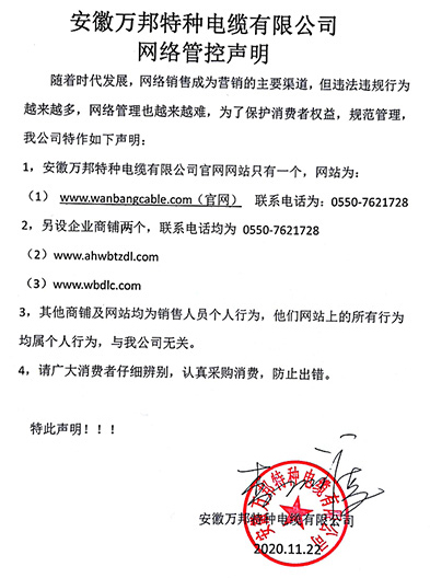 鄭重聲明:安徽萬邦特種電纜有限公司官方網站為:www_wanbangcable_com.0464x.com,除此之外無任何子網站或合作網站,其余均為假冒偽劣。電話:0550-7621728 13485756353 地 址:安徽省天長市滁州高新技術產業開發區經四路29號